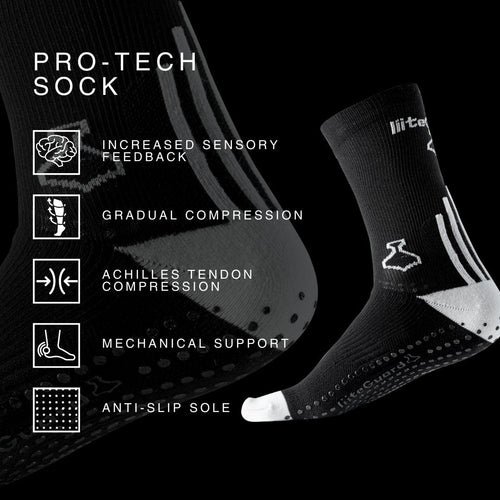 PRO-TECH er en teknisk og åndbar kompressionsstrømpe med grip designet specifikt til løb og sportsgrene med mange retningsskift som for eksempel fodbold, håndbold, padel og lignende.